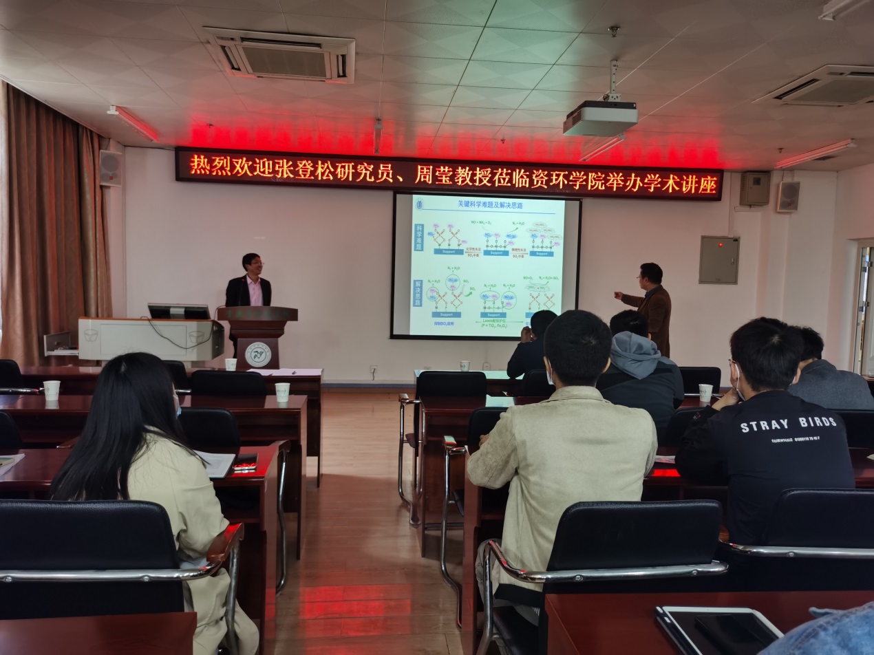 首先,张教授介绍了氮氧化物(NOx)的环境危害,它是导致酸雨、光化学烟雾、雾霾等环境问题的重要根源,对生态系统以及人体健康构成巨大威胁。紧接着,张老师介绍了目前应用最为广泛的烟气脱硝技术——氨选择性催化还原(NH3-SCR),强调高效的脱硝催化剂是该技术的核心。其中,V2O5-WO3(MoO3)/TiO2商业催化剂广泛应用于燃煤电厂的烟气脱硝,但是其温度窗口较窄(300~400℃),不适用于垃圾焚烧、钢铁、水泥、化工等非电行业的低温(<300℃)烟气NOx净化。此外,非电行业烟气中的SO2、碱金属、重金属加剧了催化剂中毒失活。随着国家对非电行业NOx排放标准的日益提升,亟待开发适用于非电行业的低温抗中毒的NOx净化催化剂。针对非电行业烟气NOx净化催化剂易中毒失活的关键科学难题,张教授课题组经过长期的攻关研究,提出了以保护位抑制催化剂中毒失活的新理念,即通过对活性位和保护位的耦合与调控,发展了对SO2、碱金属以及多重复合毒物有抗中毒作用的NOx净化催化剂,并揭示了其抑制中毒作用的新机制,有效克服了烟气复杂组分对催化剂造成的中毒效应,显著提升了NOx催化净化效率和稳定性,形成了高效稳定的NOx催化净化新技术,为非电行业NOx减排应用奠定了科学基础。报告结束后,同学们踊跃提问。张老师对大家感兴趣的问题,进行了仔细解答。