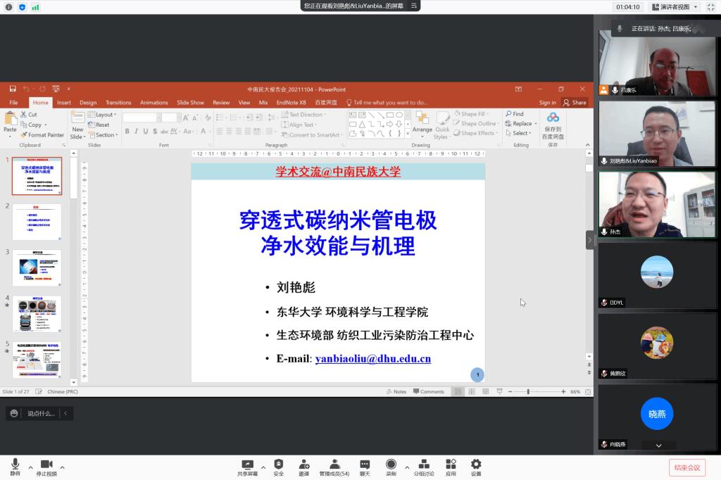 2021年11月4日下午,东华大学环境科学与工程学院教授刘艳彪老师应邀为我院师生做了题为《穿透式碳纳米管电极净水效能与机理》的线上学术讲座。学术讲座由吕康乐副院长主持,多名教师和40余名研究生同学参加。