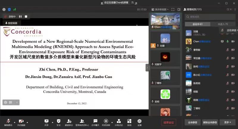 2022年12月12日下午,加拿大康考迪亚大学陈志教授应邀为我院师生做了题为《开发区域尺度的数值多介质模型来量化新型污染物的环境生态风险》的线上学术报告,报告由孙杰教授主持,我院师生积极参加。