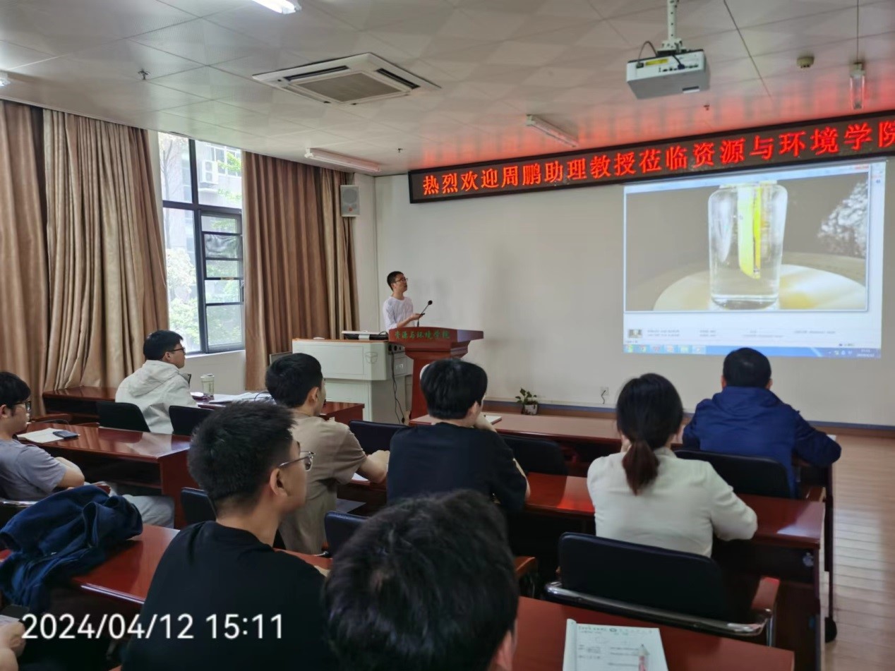 2024年4月12日下午在学院261报告厅,北京大学周鹏助理教授应邀为我院师生做题为《光催化太阳能氢燃料制备》的学术报告。本场报告会由吕康乐教授主持,资环学院和化材学院的60余名师生参与了本次讲座。