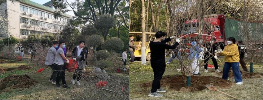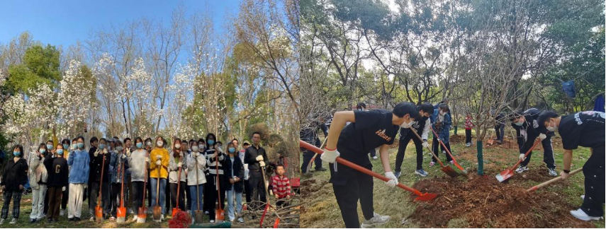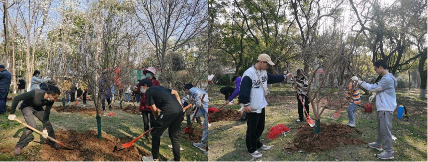 一年之计在于春,一日之际在于晨。在春意盎然的清晨,老师同学们来到南湖园植树点。园林科的老师对同学们参与植树活动、保护环境的意识表示了赞赏,并仔细地为同学们讲解了植树的要领。紧接着,同学们被分成了三人小组,大家互相配合,按着老师的指示,纷纷忙碌起来,男生先组队从卡车上卸载苗木,卸载完成后植树正式开始。只见大家有的挥锹铲土,有的扶树填土,有的培土浇水,每个人都忙得不亦乐乎,也深切地接触到了大自然,活动中,黄老师和同学们不怕脏不怕累,俯身间脸上都露出了劳动者的笑容,嗅着新翻泥土的气息,望着生命蓬勃的小树,同学们嘴角上扬,自豪之情油然而生。经过大家的辛勤劳动,一排排整齐的石榴树在南湖园“安家立户”。虽然大家脚底下全是泥土,但眼前这一片新生的石榴林让大家满心欢喜。