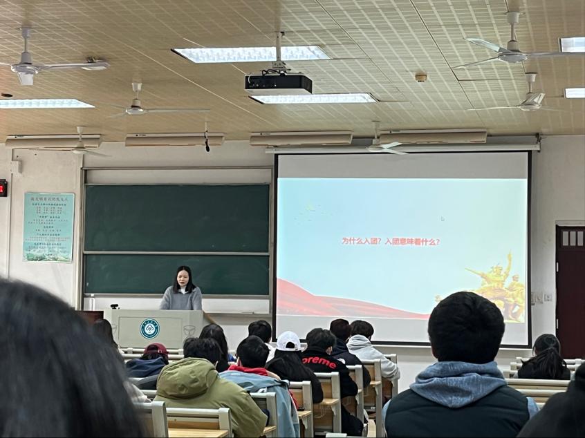 王莹莹老师首先用“为什么入团?入团意味着什么?怎样做才算一名合格的团员?”三个问题引导同学们思考自己入团的初心是什么。紧接着王莹莹老师分享了自身的经历,以此来劝诫同学们作为团员应努力提高思想政治觉悟,以更高的标准来要求自己,做周围同学的榜样,珍惜眼下资源条件,踔厉奋发。