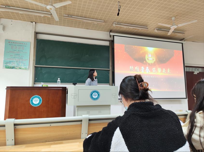 本次团课主题为“学习团史,做新时代合格建设者和接班人”,王莹莹老师以习近平总书记在党的二十大报告中的讲话为切入点,鼓励作为青年一辈的我们要自立自强,敢想敢做,勇担时代重任,不负党和国家的期望。