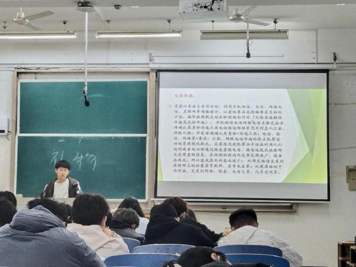 随后又对beat365官网经常发生的电信诈骗进行了再次科普,并总结:凡是交钱的都是电信诈骗。同时,提醒同学们最近是双十一电商购物快递投放的高峰时期,刷单返利类和冒充电商购物客服类案发尤为突出,提倡大家要牢固自己的心理防线不贪图小利以及贷款选择正规平台的防范技巧。最后,通过新奇有趣的视频结尾,即活跃了气氛,又让大家深刻明白大多数电信诈骗,建立起一定的心理防线。