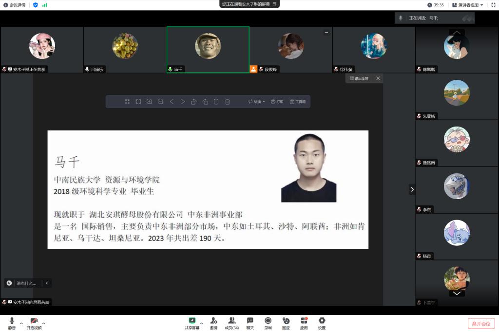首先,马千学长应邀为大家做了就业指导报告。他目前就职于湖北安琪酵母股份有限公司,任中东非洲事业部国际销售经理。2023年他所负责的市场销售额高达6000万,超额完成公司任务的15%。马千学长为大家详细地介绍了其大学履历和工作体会。不同于其他保研考研的学长学姐,马千学长的大学生活其实并不太丰富,更多的是教室食堂和宿舍三点一线,社交活动单一,学习成绩平平,这也代表了当下大部分大学生的现状,容易出现“持续性躺平,间歇性努力”的状态。对此,马千学长用自己毕业求职的经历来告诫同学们提升自我、珍惜时间的重要性,以及大学期间要重视专业课和英语的学习,四六级英语证书也会成为面试失分的因素,而善于思考、沉着冷静的心态也有助于顺利地求职。对于大多数同学纠结的考研和工作选择,马千学长则认为要结合自身实际情况,而不是盲目随大流,基于对专业和科研的感兴趣程度和自身学习能力的情况再去选择是否考研,若选择考研一定要坚持下去,不能半途而废。