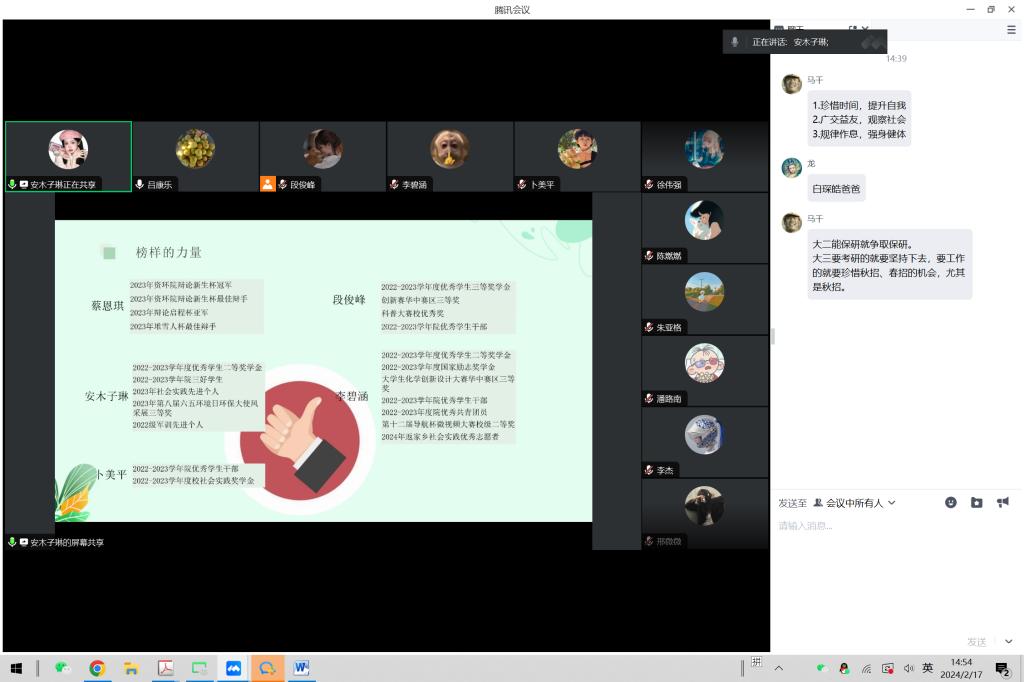 近50名同学及家长一起参加了本次学前线上班会。本次班会大家发言踊跃,达到了分析有深度和沟通有温度的效果,为今后家校协同助力学生成长成才提供了新路径。