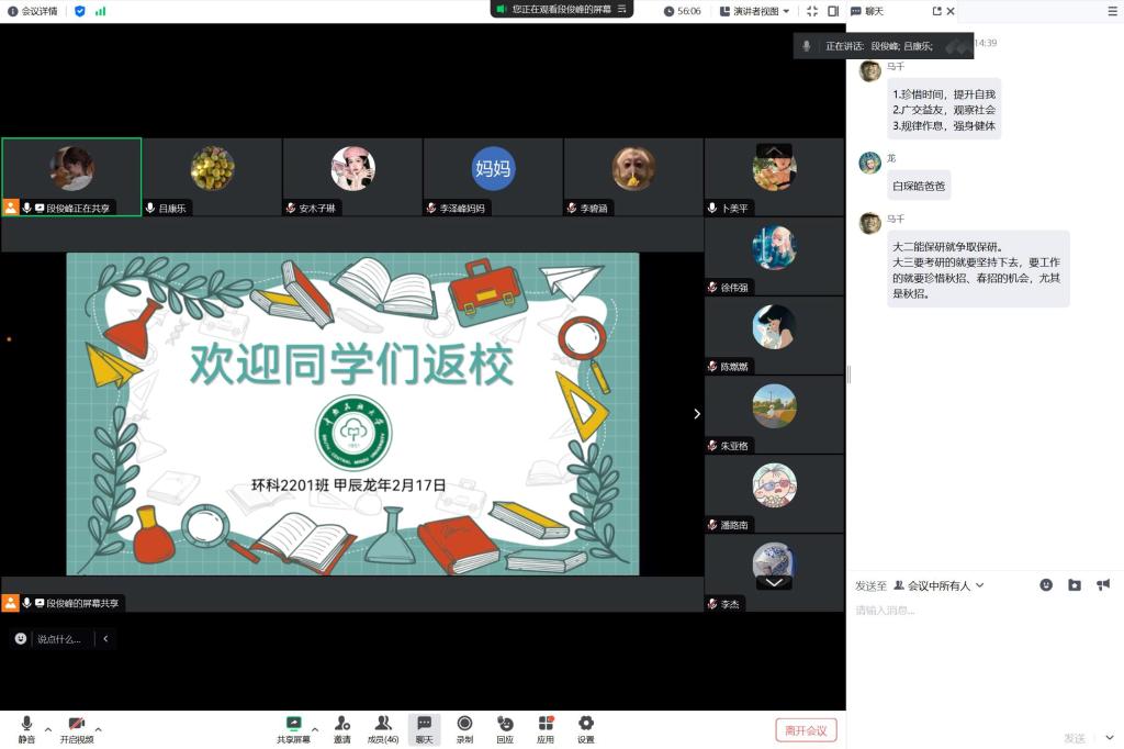 在龙年伊始,环科2201班于2月17日召开新学期开学之前的第一次线上班会,邀请到2022届环境科学专业毕业生马千学长分享学习和工作经验,并总结班级工作,开展新学期学习规划。本次班会由班导师吕康乐教授主持。