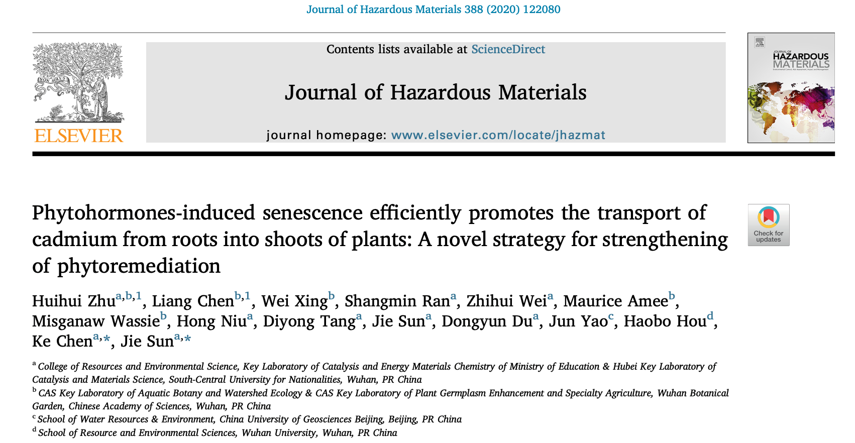 近日,beat365英国正版唯一网址资源与环境学院环境修复课题组在Journal of Hazardous Materials(2019年IF=7.65)在线发表题为“Phytohormones-induced senescence efficiently promotes the transport of cadmium from roots into shoots of plants: A novel strategy for strengthening of phytoremediation”的研究论文,提出了一种具有广泛适应性的植物修复强化新策略。该校2015级环境科学专业的本科生祝慧慧同学为论文第1作者,陈柯副教授和孙杰教授为通讯作者。论文合作单位包括中科院武汉植物园、武汉大学资源与环境学院和中国地质大学(北京)水资源与环境学院。