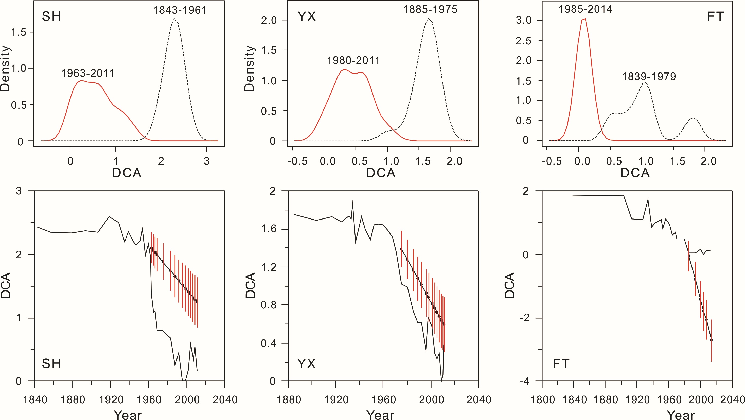 (1)过去百年来,城乡梯度上不同位置湖泊的生态环境演化轨迹、稳态转换点及当前生态状态都显著不同(如图)。距离市中心越近,系统稳态转换越早,且距离市区较近的湖泊富营养化趋势明显;