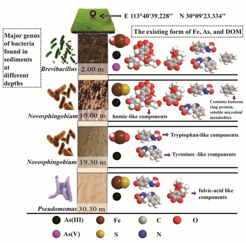 该论文通过对江汉平原沉积物中砷的赋存形态、荧光溶解有机物(DOM)、微生物群落结构以及一系列阴离子和阳离子的垂直分布的研究,揭示地下水中砷在含水层中的富集、迁移转化规律。结果显示富砷层沉积物中的TOC和 DOM含量较低。沉积物中砷的随深度变化的有以下三种主要形式:FeOOH、-COO-和FeAsS。微生物群落也随深度变化,Novosphingobium和Brevibacillus在沉积物剖面图中表现出相对较高丰富度。