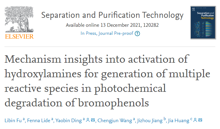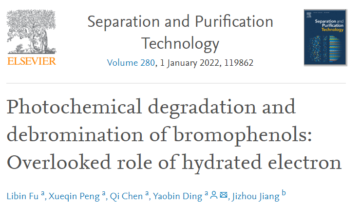 2021年9和12月,我院丁耀彬副教授在国际期刊《Separation and Purification Technology》发表了姊妹篇论文,揭示了溴酚光化学降解中的水合电子的关键作用及其羟胺活化机理。论文第一作者为我院研究生符丽彬,通讯作者为丁耀彬副教授。