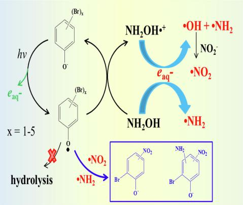 3. 羟胺的存在改变了溴酚光解途径产生了硝基化产物。HA作为氮循环的中间体,在自然水环境中普遍存在。在TBP的光解过程中,HA的存在显著抑制了C•的水解反应,从而抑制了羟基化中间体(例如单羟基化的2,6-二溴苯酚)的形成。同时,HA的存在导致了两种具有高毒性和环境风险的硝基溴酚副产物的形成。这一发现对于理解地表水中羟胺和有机物的光化学转化及硝基化副产物的生成具有重要意义。