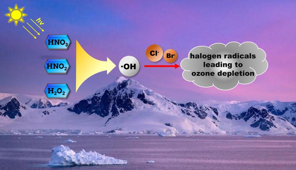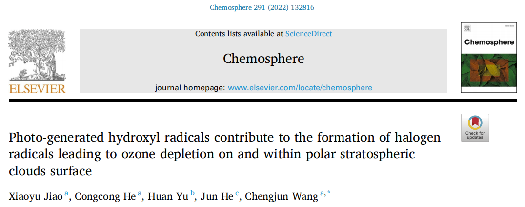 我院王成俊教授课题组在环境科学类期刊《Chemosphere》发表了题为《Photo-generated hydroxyl radicals contribute to the formation of halogen radicals leading to ozone depletion on and within polar stratospheric clouds surface》的研究成果,提出了极地平流层云表面微液层中卤素自由基光化学生成与极地“臭氧黑洞”形成的新机制。研究生焦啸宇为该论文第一作者,王成俊教授为通讯作者。
