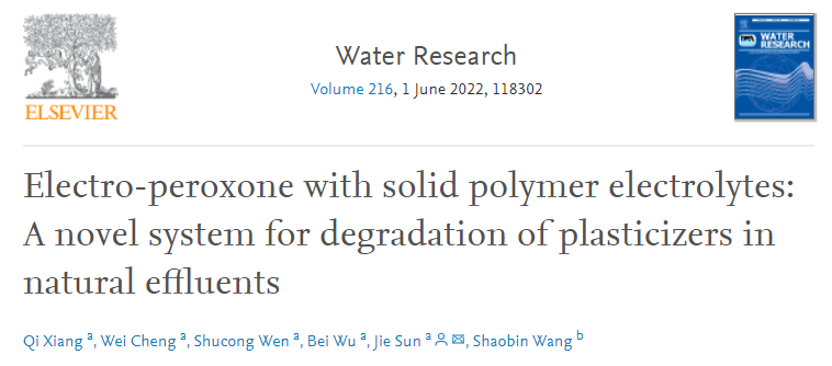 我院孙杰教授课题组在国际水协会刊、环境领域Nature指数顶级期刊《Water Research》发表了题为《Electro-peroxone with solid polymer electrolytes: A novel system for degradation of plasticizers in natural effluents》的研究成果,提出了一种新型降解自然水体中塑化剂的电化学体系。研究生向琦为该论文的第一作者,孙杰教授为通讯作者。
