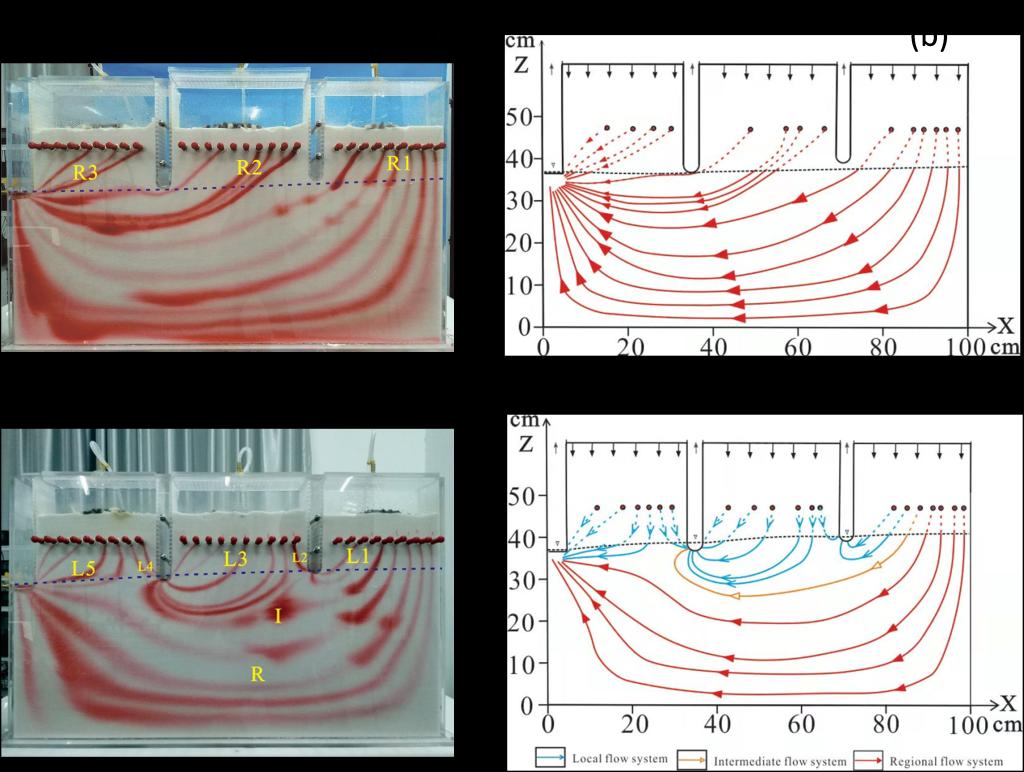通过联合求解溶质质量平衡方程和水量平衡方程,计算出了各流动系统的循环速率,定量解释了实验中遇到的现象,突出了中间和区域水流系统对整个地下水循环的重要贡献。