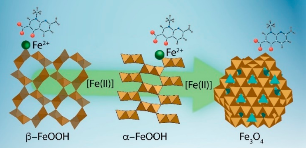 在实际环境中,Fe(II)与铁(氢)氧化物常常共存,Fe(II)不仅能与抗生素形成络合物,还能吸附在铁(氢)氧化物上并且诱导铁(氢)氧化物发生晶相转变,这些过程会影响铁(氢)氧化物的结构与性质。