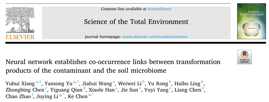 2024年3月,我院碳与环境修复团队在环境领域权威期刊《Science of the Total Environment》(中科院一区 TOP)上发表最新研究成果:Neural network establishes co-occurrence links between transformation products of the contaminant and the soil microbiome,首次应用神经网络分析解析微生物在污染物环境转化过程中的作用。我院硕士研究生向宇辉为论文第一作者,陈柯副教授为论文通讯作者。