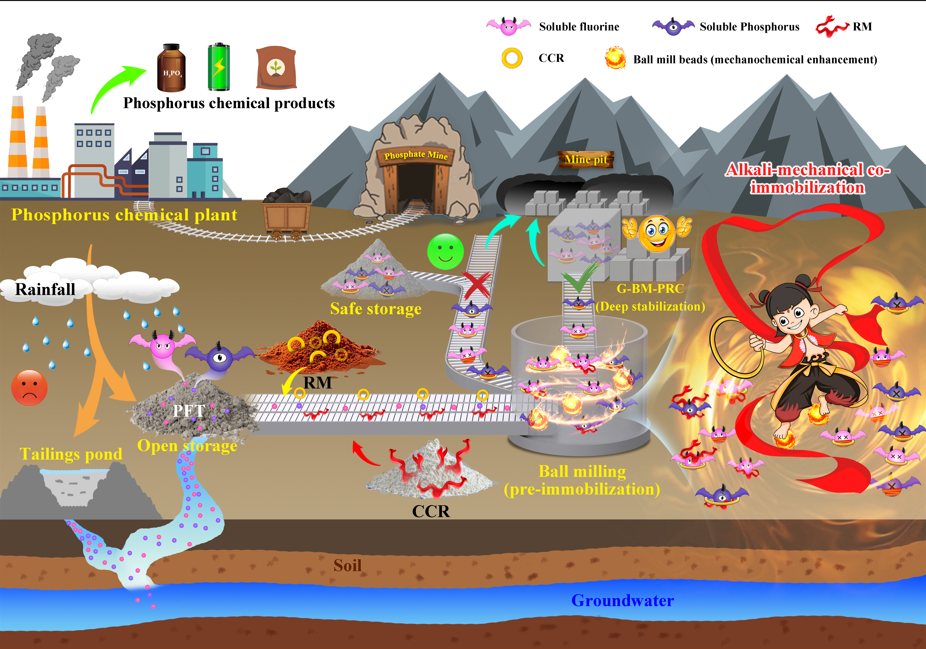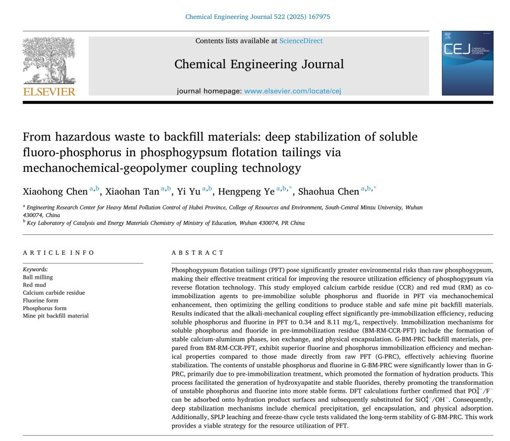 近日,beat365官网杜冬云教授课题组在化工和环境工程领域权威期刊《Chemical Engineering Journal》(中科院一区 TOP,IF=13.4)上发表了题为《From hazardous waste to backfill materials: deep stabilization of soluble fluoro-phosphorus in phosphogypsum flotation tailings via mechanochemical-geopolymer coupling technology》的最新研究成果。该研究针对磷石膏反浮选提质过程中产生的磷石膏浮选尾渣(PFT)内可溶性磷、氟迁移风险高的问题,提出了一种基于碱-机械协同作用耦合地质聚合技术的协同处理方法,为实现PFT从危险固废向稳定回填材料的低碳资源化转变提供了新路径。本研究beat365官网资环学院硕士研究生陈小红为论文第一作者,叶恒朋教授和陈绍华副教授为论文的共同通讯作者,beat365英国正版唯一网址为唯一通讯单位。