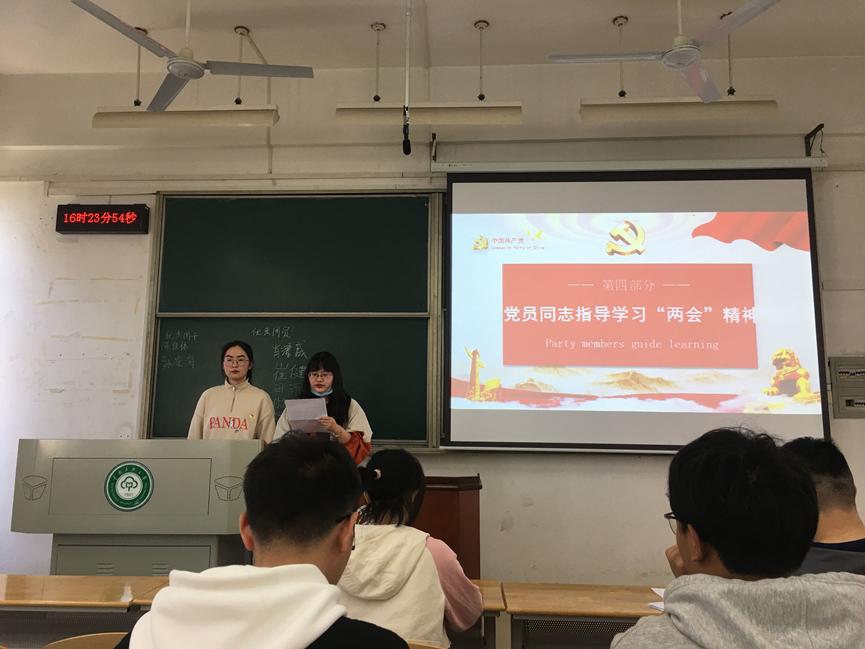 党员同志的领学各有侧重,如刘钦同志带领环科1801班团支部学习习近平总书记在党史学习教育动员大会上的重要讲话,讲解优秀党员故事,号召同学们牢记初心使命,勇担时代重任。邓承宇同志在团会上对“两会”主要内容和精神进行了领学,也讲明了“两会”代表的人民性和使命职责,并号召同学们不辱历史使命,不负重托。预备党员何兴昌同志在水文1901班团会上,从 “远景目标”、“新发展格局”、“绿色转型”等两会热词入手,结合学院专业特点和未来发展趋势,带领团支部深学细悟“两会”精神。