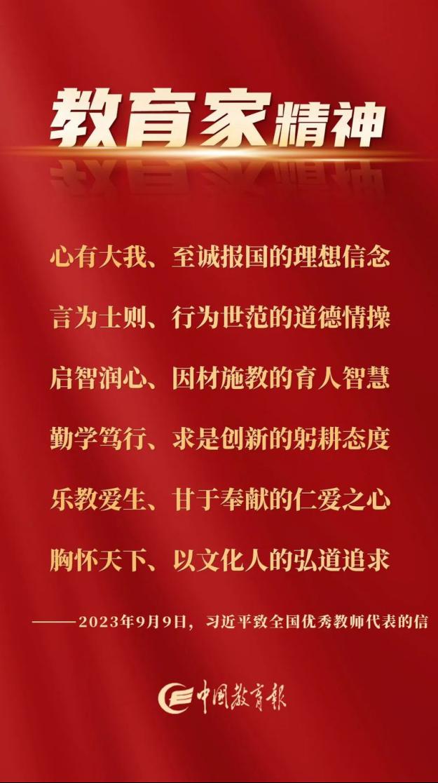 长期以来,以你们为代表的全国广大教师认真贯彻党的教育方针,教书育人、培根铸魂,培养了一代又一代德智体美劳全面发展的社会主义建设者和接班人,造就了大批可堪大用、能担重任的栋梁之才,为国家发展、民族振兴作出了重要贡献。教师群体中涌现出一批教育家和优秀教师,他们具有心有大我、至诚报国的理想信念,言为士则、行为世范的道德情操,启智润心、因材施教的育人智慧,勤学笃行、求是创新的躬耕态度,乐教爱生、甘于奉献的仁爱之心,胸怀天下、以文化人的弘道追求,展现了中国特有的教育家精神。