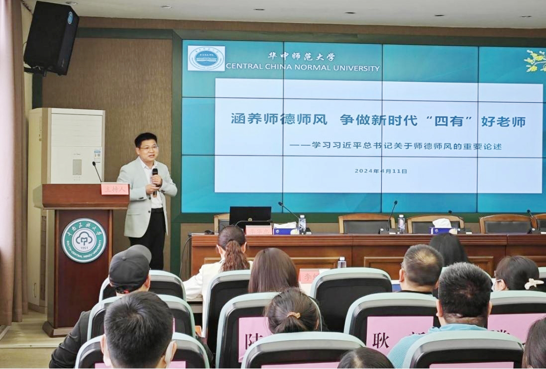 华中师范大学历史文化学院分党委书记李华忠以《涵养师德师风 争做新时代“四有”好老师》为题,分析了当前师德师风建设的形势,详细讲解了新时代党和国家对教师师德师风的要求,以及当前师德师风存在的典型问题。他强调广大教师要遵循教书育人规律、学生成长规律,在“培养什么样的人、如何培养人以及为谁培养人”的问题上旗帜鲜明,做到以德立身、以德立学、以德施教,为培养德智体美劳全面发展的社会主义建设者和接班人作出贡献。